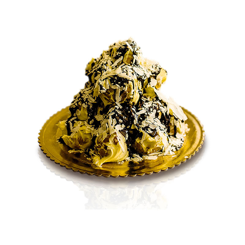 A unique Italian classic featuring a tower of light, airy profiteroles filled with Italian crema. The mound is smothered in chocolate & a creamy hazelnut crema finished with delicate chocolate flakes.